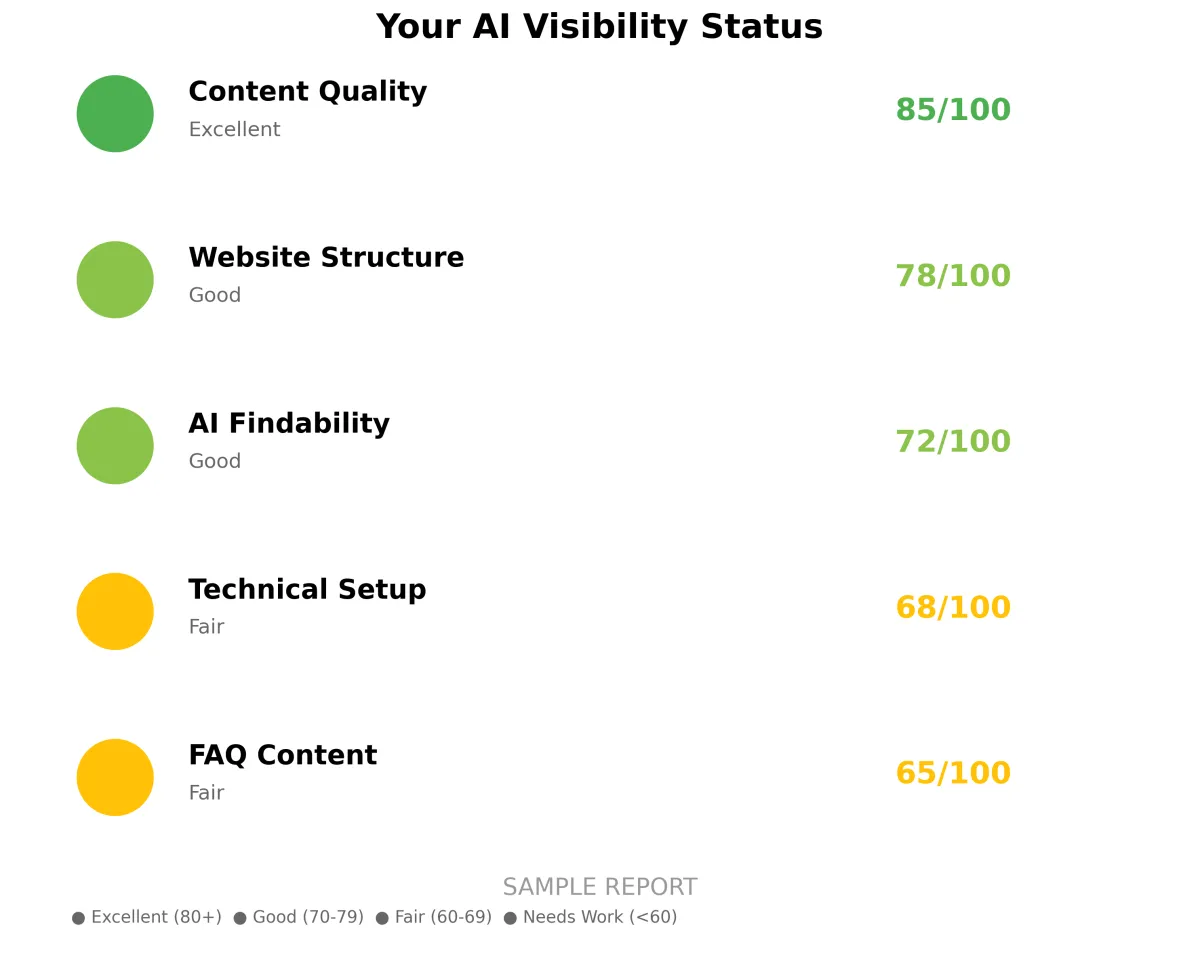 Your report measures how your website performs in key categories like content quality, structure, and technical setup — showing exactly what’s helping or hurting your visibility.